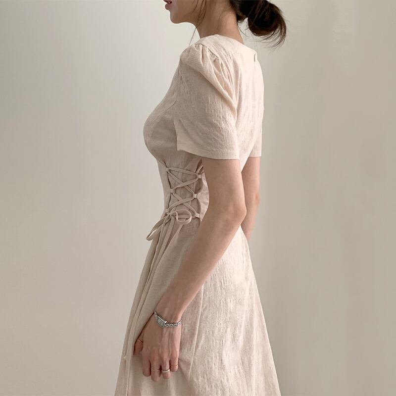 ウエストサイドにはレースアップの紐が施されていて、シェイプアップにもなる美ラインワンピースです。