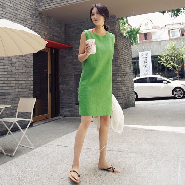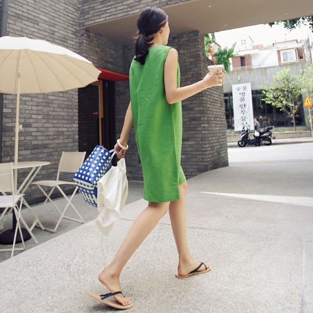 鮮やかなビタミンカラーのグリーンが映える涼し気なリネンワンピースは大人カジュアルコーデにも