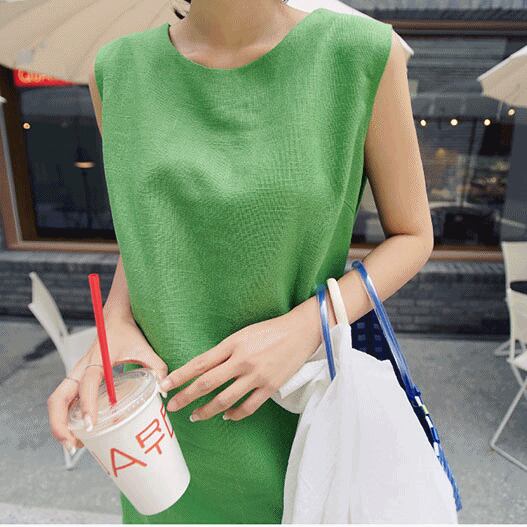 ノースリーブ ワンピース 膝上 ひざ丈 スリット 無地 フレア Aライン ラウンドネック ワンピ オシャレ 大人 レディース リネン 麻 春 夏