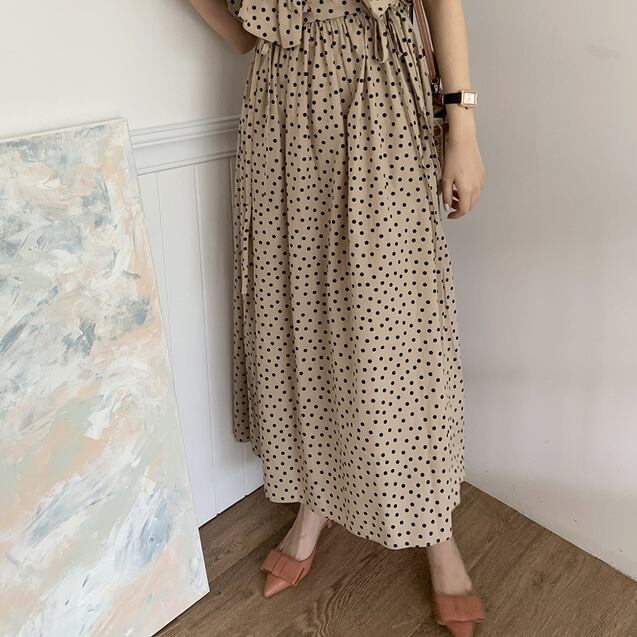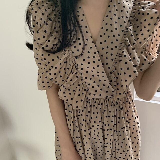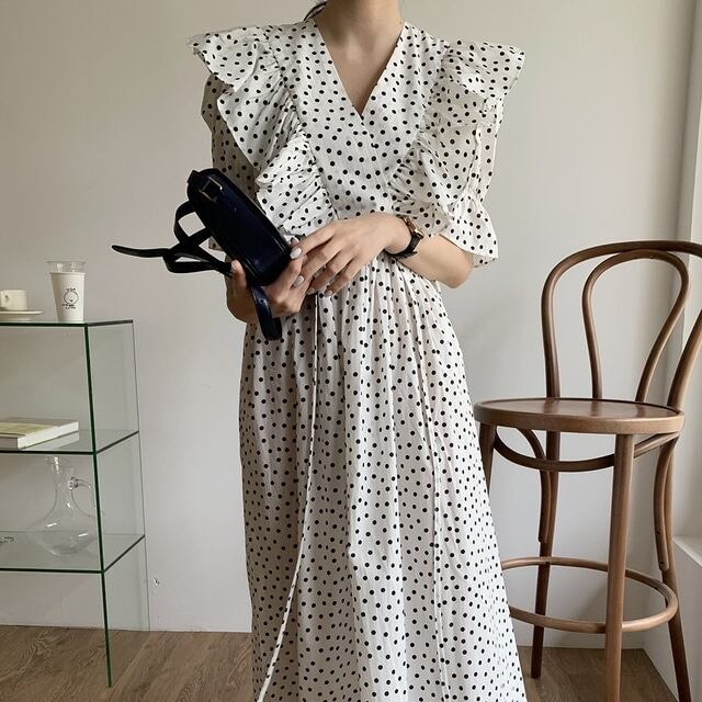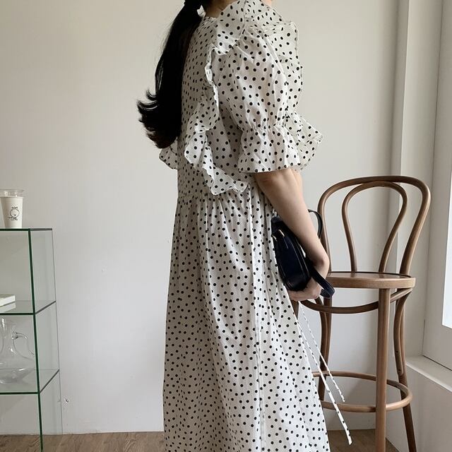 全2色 ワンピース ドット柄 フリル Vネック ウエストゴム ロング ワンピ 水玉柄 大人 レディース ランタンスリーブ 5分袖 おしゃれ かわいい カジュアル エレガント 上品 レトロ クラシカル