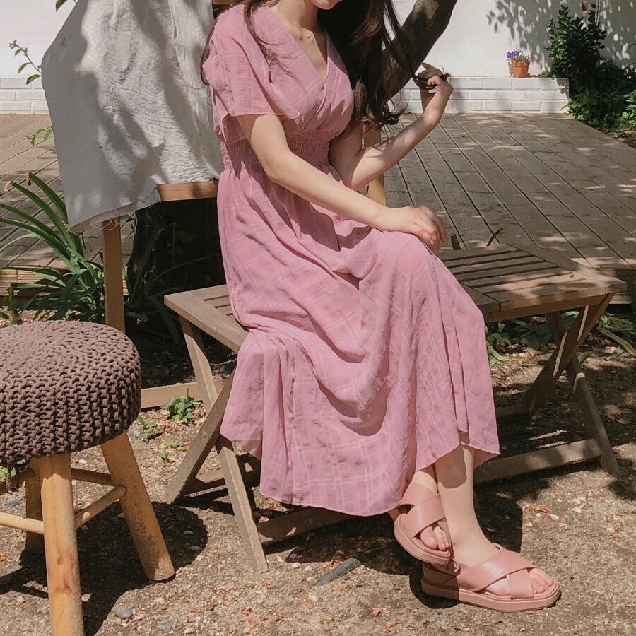 全2色 ワンピース Vネック ロング 半袖 ウエストゴム 無地 Aライン カシュクール フレア シンプル ワンピ エンパイア チェック柄 エレガント 大人 上品 クラシカル シック かわいい おしゃれ おでかけ デート 旅行 女子会 お呼ばれ 春 夏