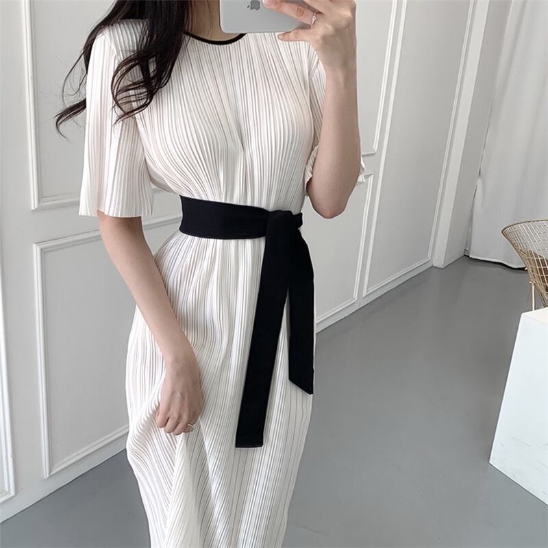 ワンピース プリーツ 半袖 ウエストマーク リボン シンプル タイト スリム ミディ丈 ロング ワンピ 無地 シンプル おしゃれ 大人 上品 エレガント かわいい おしゃれ クラシカル シック モノトーン 白 春 夏