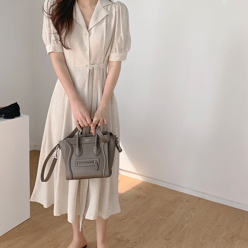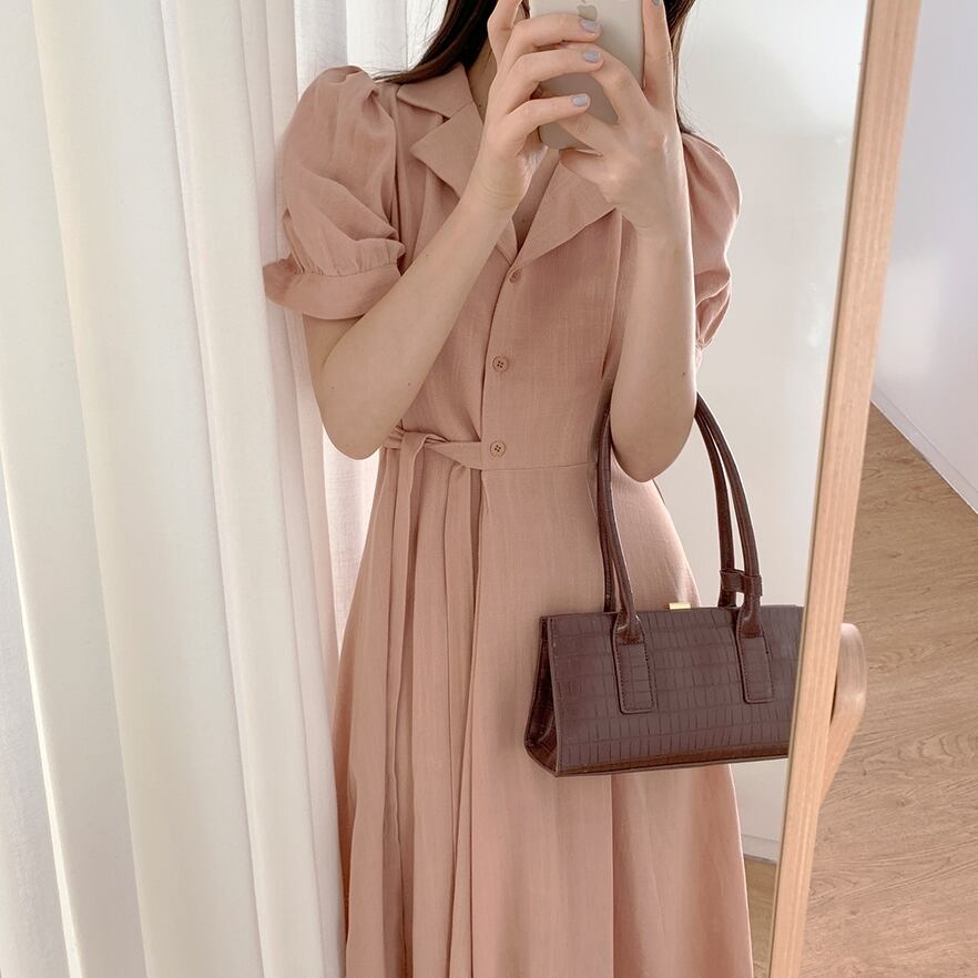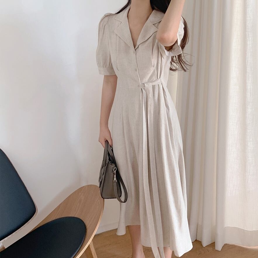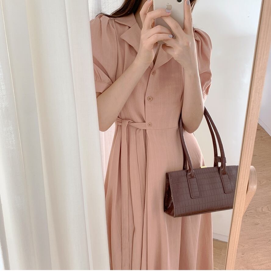 全2色 ワンピース ボタン 襟 パフスリーブ Vネック ウエスト リボン 無地 シンプル レトロ かわいい おしゃれ 大人 レディース 上品 エレガント クラシカル シック フェミニン 春 夏