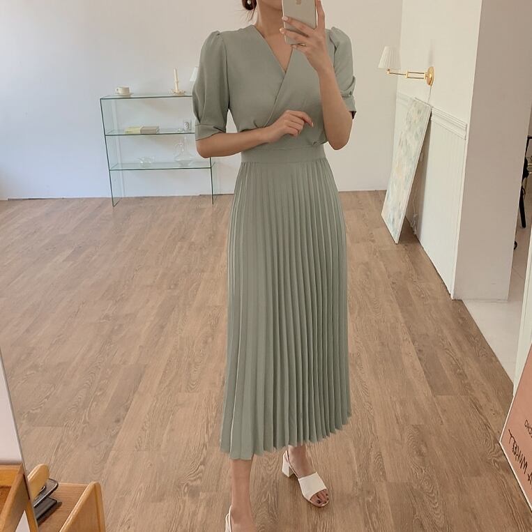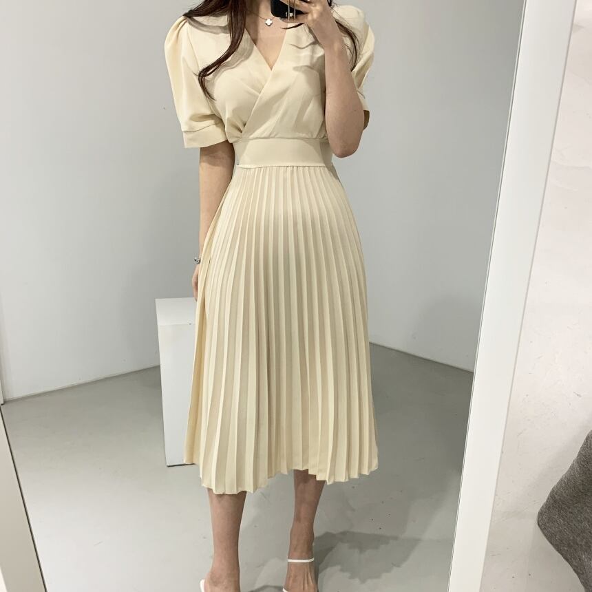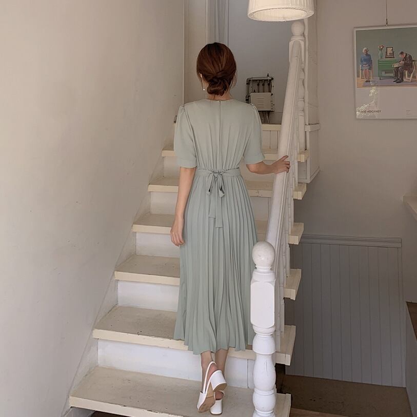 全2色 ワンピース プリーツ Vネック ウエストシェイプ カシュクール ウエストマーク リボン 無地 シンプル 半袖 パフスリーブ かわいい 女子 レディース 上品 エレガント レトロ 大人 フェミニン おしゃれ ロング ワンピ 春 夏 女子会 おでかけ デート
