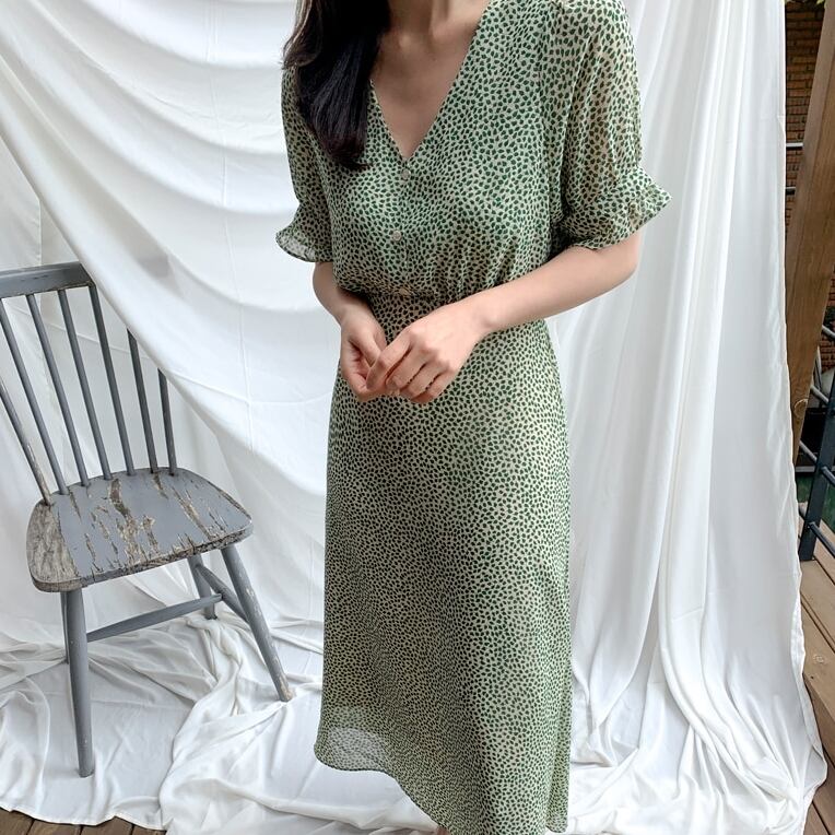 ワンピース Vネック リーフ柄 ドット柄 シフォン ランタンスリーブ ウエストゴム ロング ワンピ シースルー ボタン レトロ クラシカル シック 大人 上品 エレガント かわいい おしゃれ シンプル おでかけ デート お呼ばれ 女子会 春 夏