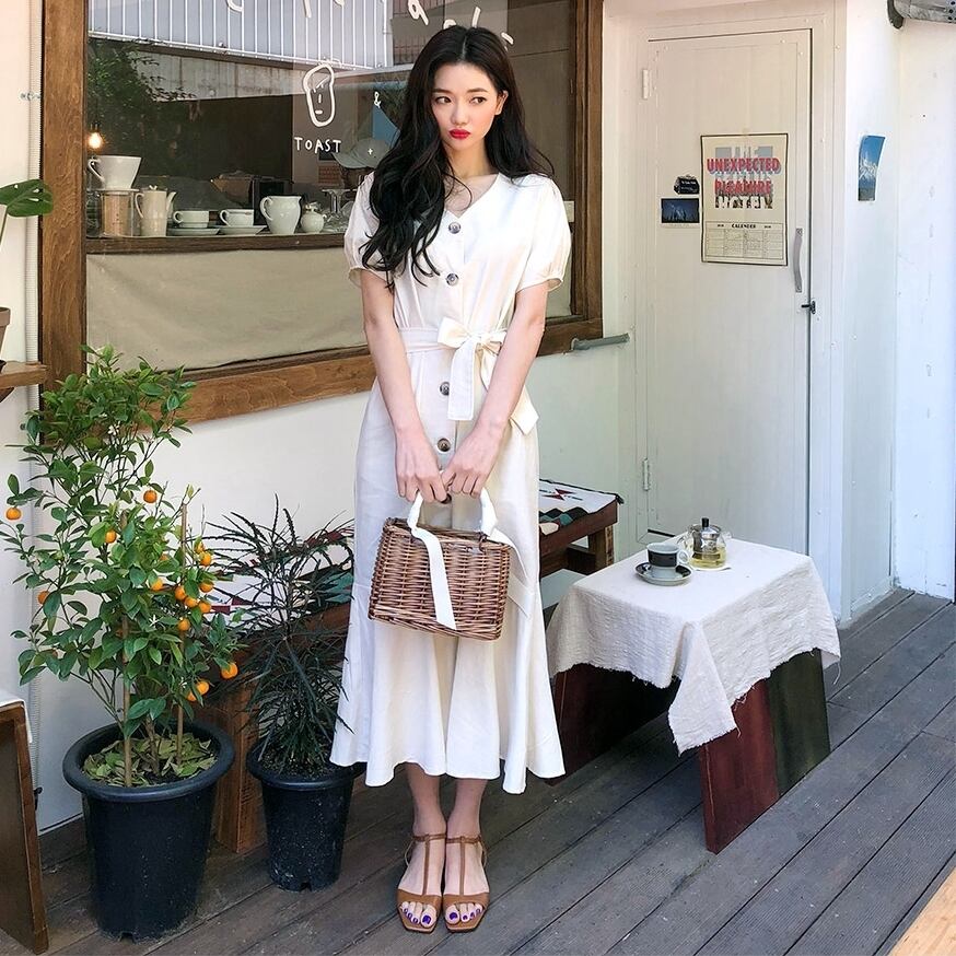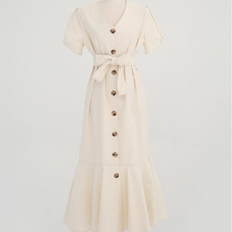 ワンピース フリル ボタン べっ甲 Vネック ボタンダウン 半袖 ウエストマーク リボン フレア Aライン かわいい 無地 シンプル 大人 レディース おしゃれ エレガント カジュアル デート おでかけ 女品 春 夏 オフホワイト