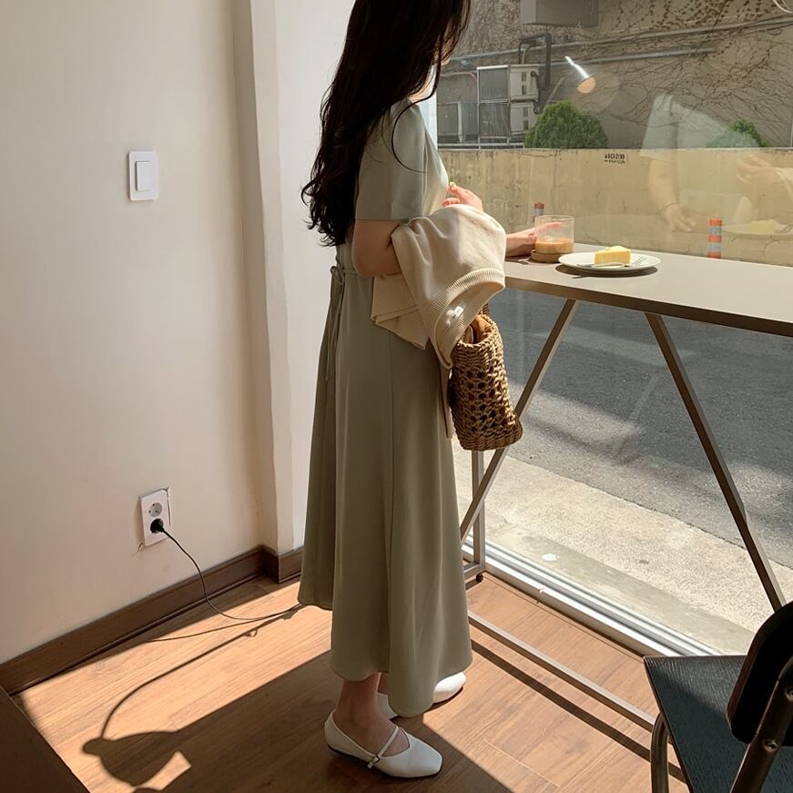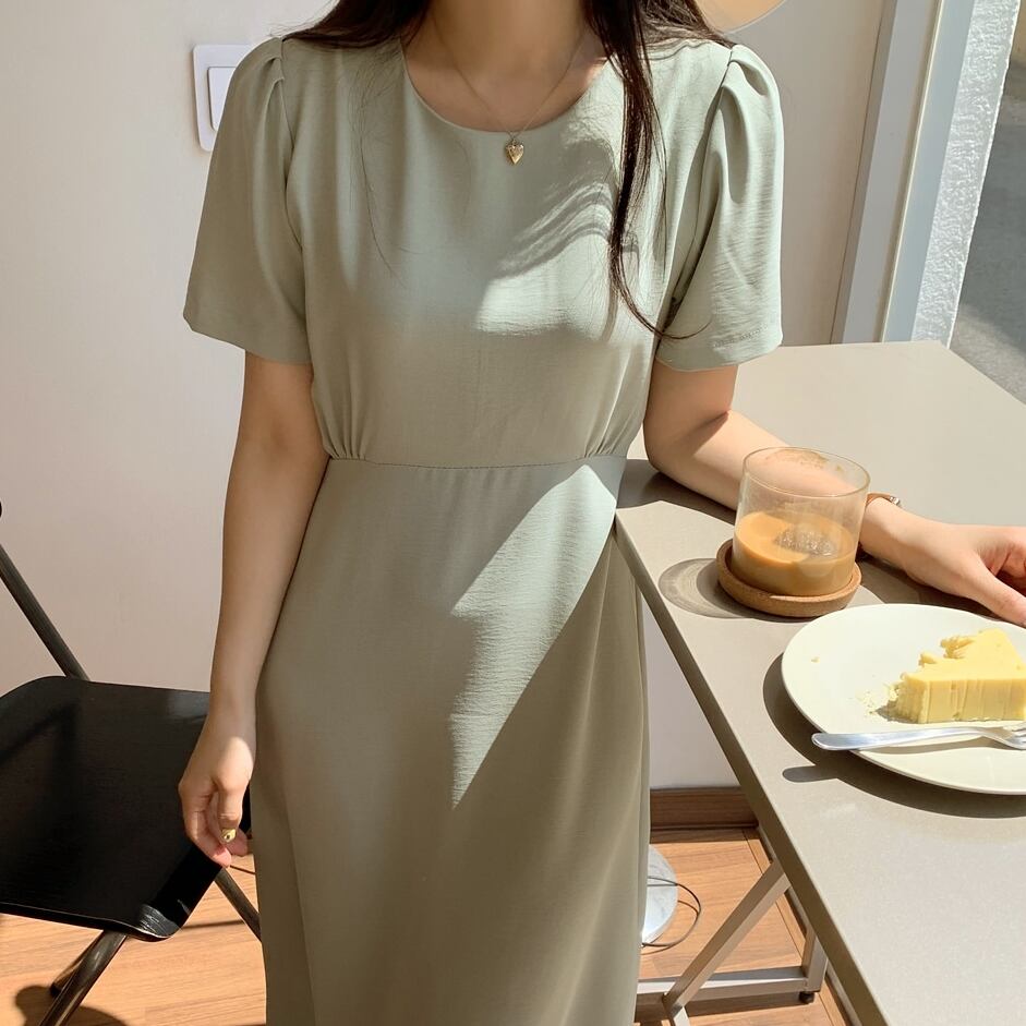 ワンピース ロング ワンピ 無地 シンプル 半袖 ラウンドネック Aライン タック ハイウエスト おでかけ レディース 大人 女子 おしゃれ かわいい フェミニン カジュアル デート クラシカル シック 春 夏