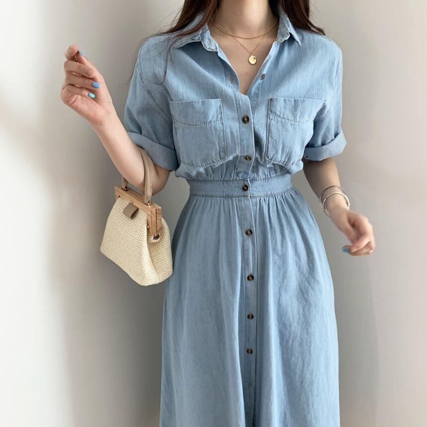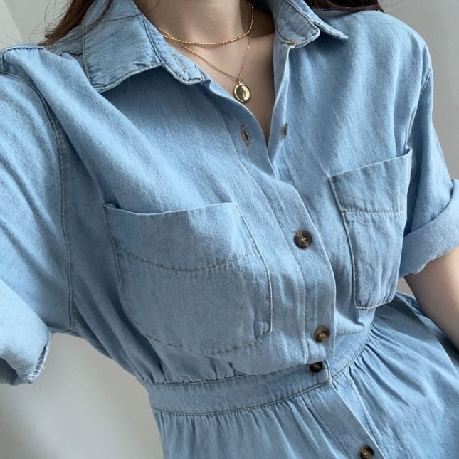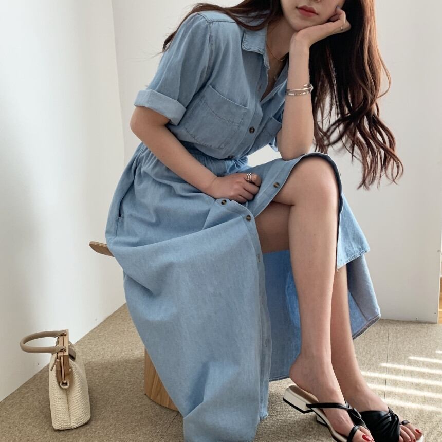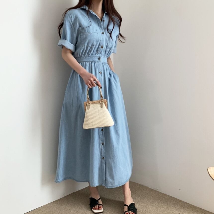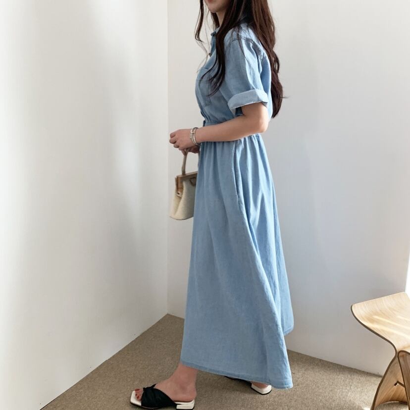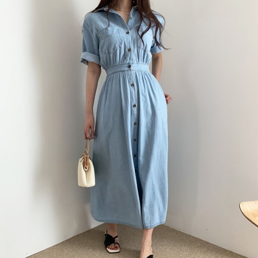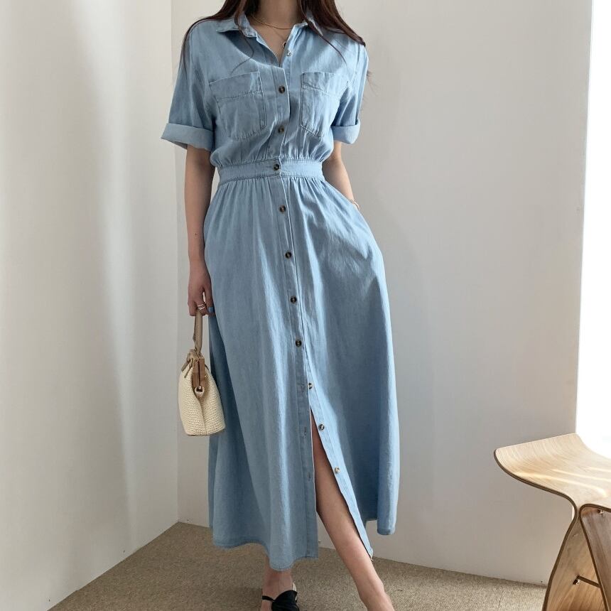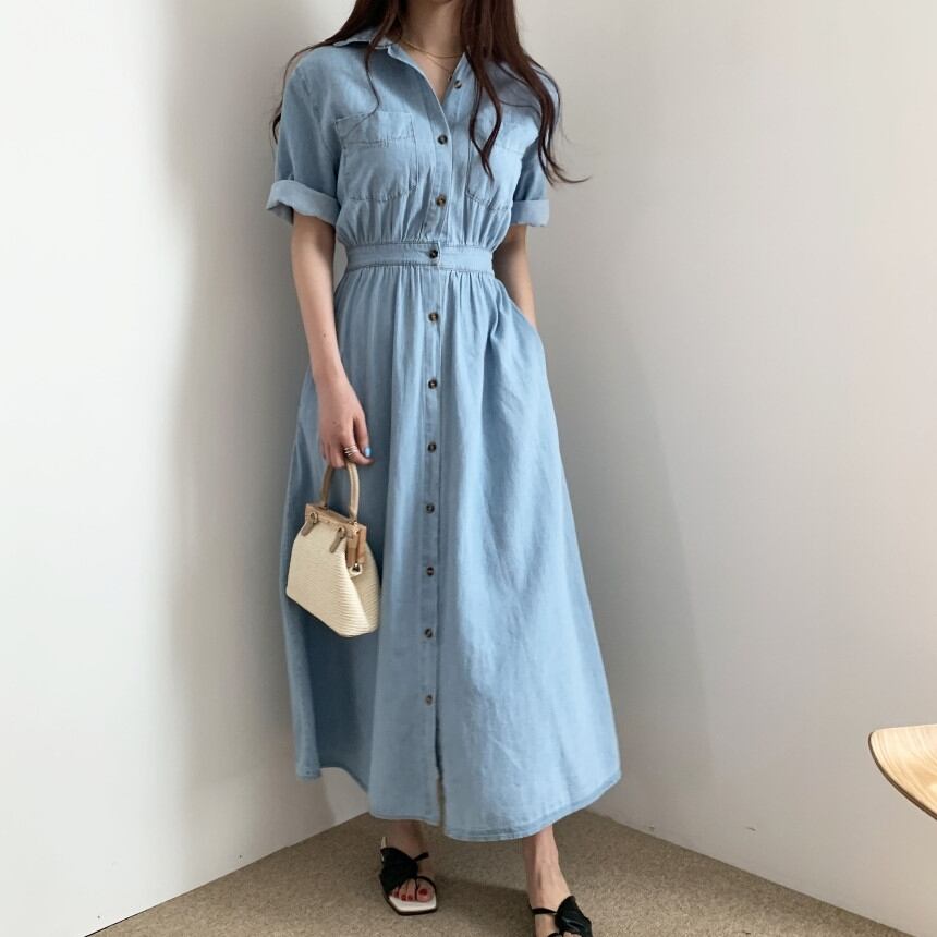ワンピース デニム シャツ ロング ワンピ 無地 ハイウエスト ボタンダウン Vネック 半袖 ウエストゴム シンプル カジュアル おしゃれ 上品 エレガント ガーリー フェミニン デート レジャー おでかけ 春 夏 秋