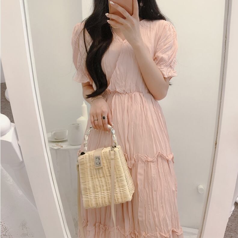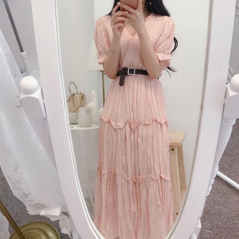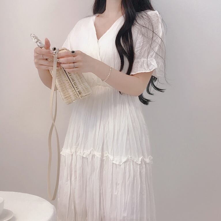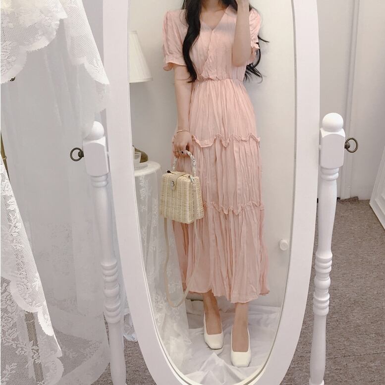 全2色 ワンピース Vネック 5分袖 ティアード Aライン フリル フレア 無地 シンプル Vネック シワ加工 おしゃれ レディース 大人 フェミニン 無地 シンプル ガーリー 妹コーデ かわいい エレガント 春 夏 おでかけ 女子会