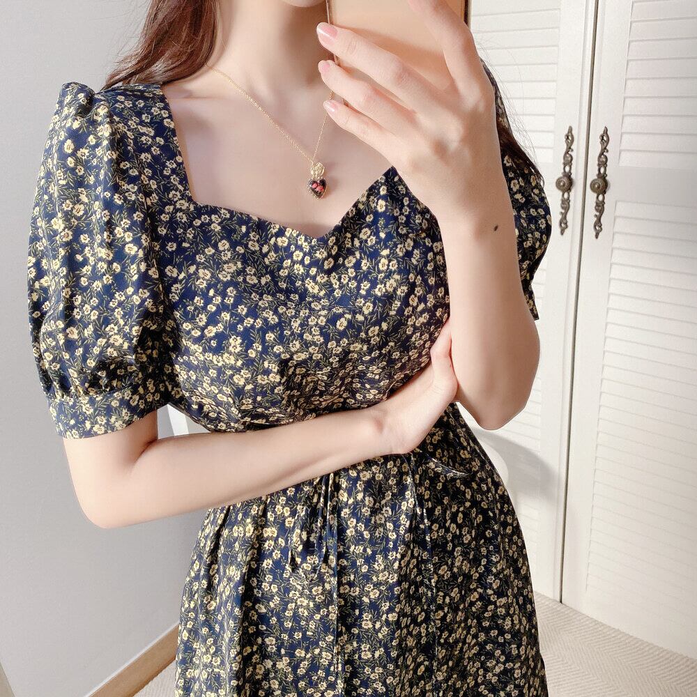 全2色 ワンピース ミニ ワンピ 花柄 フラワー柄 小花柄 フリル パフスリーブ スクエアカラー ウエストマーク リボン ガーリー 大人 レディース 女子 かわいい フェミニン レトロ おしゃれ フレンチ 春 夏 デート おでかけ レジャー 女子会