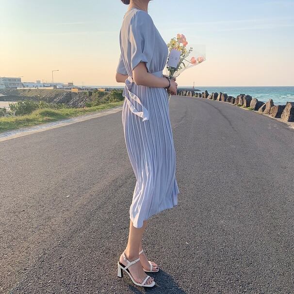 ワンピース 無地 シンプル 膝下 ロング ワンピ プリーツ パフスリーブ ウエストマーク リボン ファスナー ジップ Aライン おでかけ デート レジャー お呼ばれ パーティーフォーマル オフィス 春 夏 エレガント 上品 フェミニン
