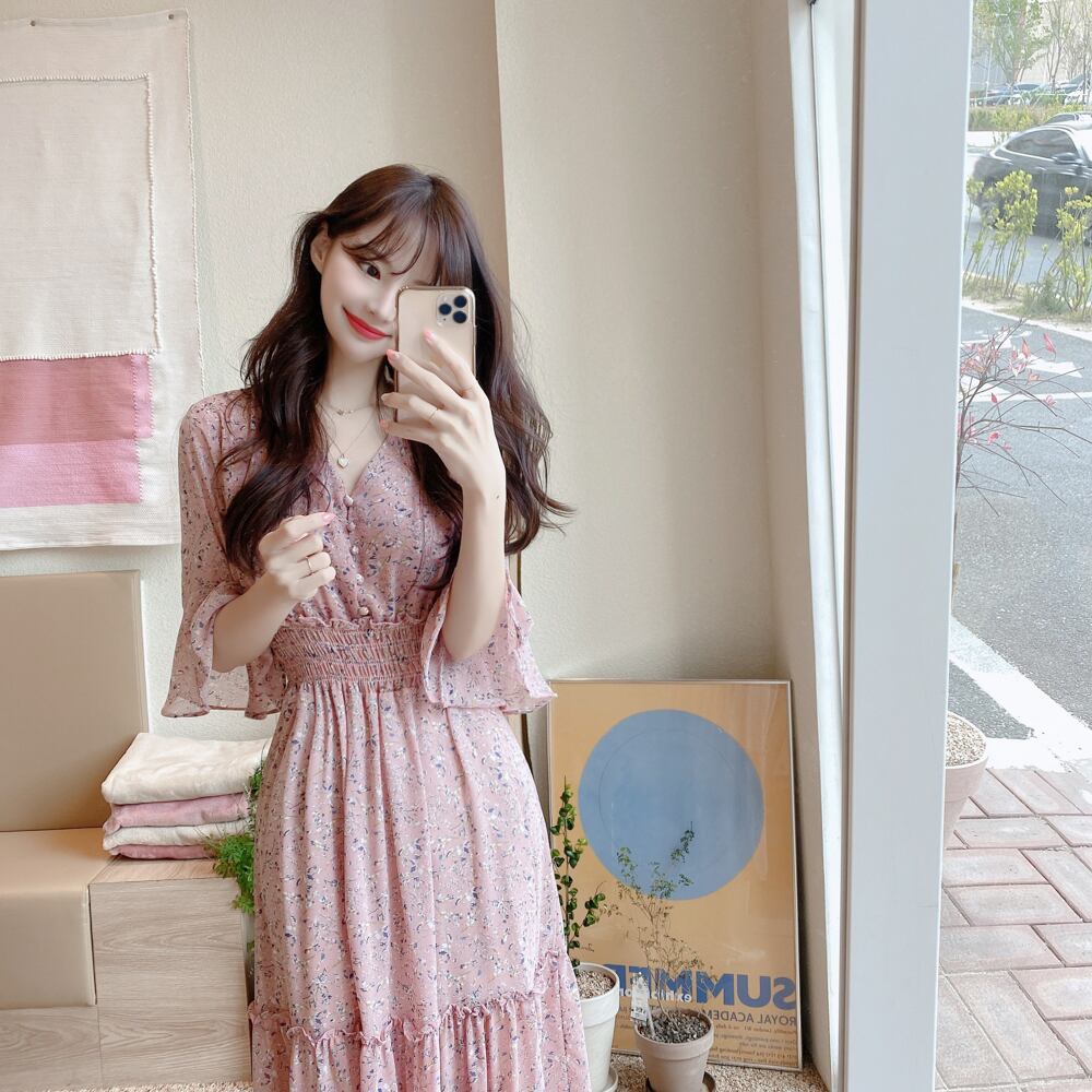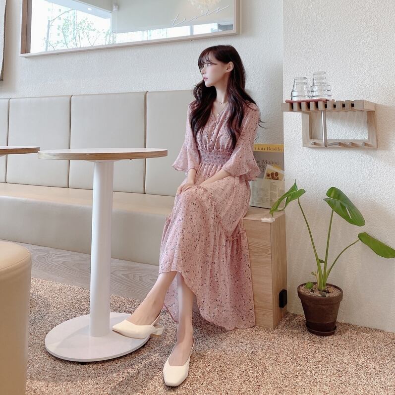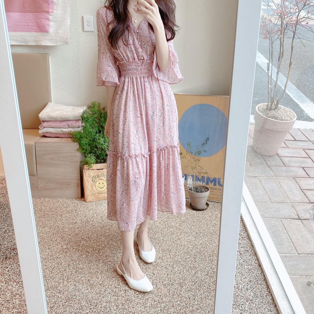 全2色 ワンピース 花柄 ロング ワンピ フラワー柄 シフォン Vネック 5分袖 フリル フレア Aライン ハイウエスト 女子 レディース フェミニン ガーリー エレガント 上品 姫系 かわいい おしゃれ 春 夏 デート おでかけ 旅行 レジャー