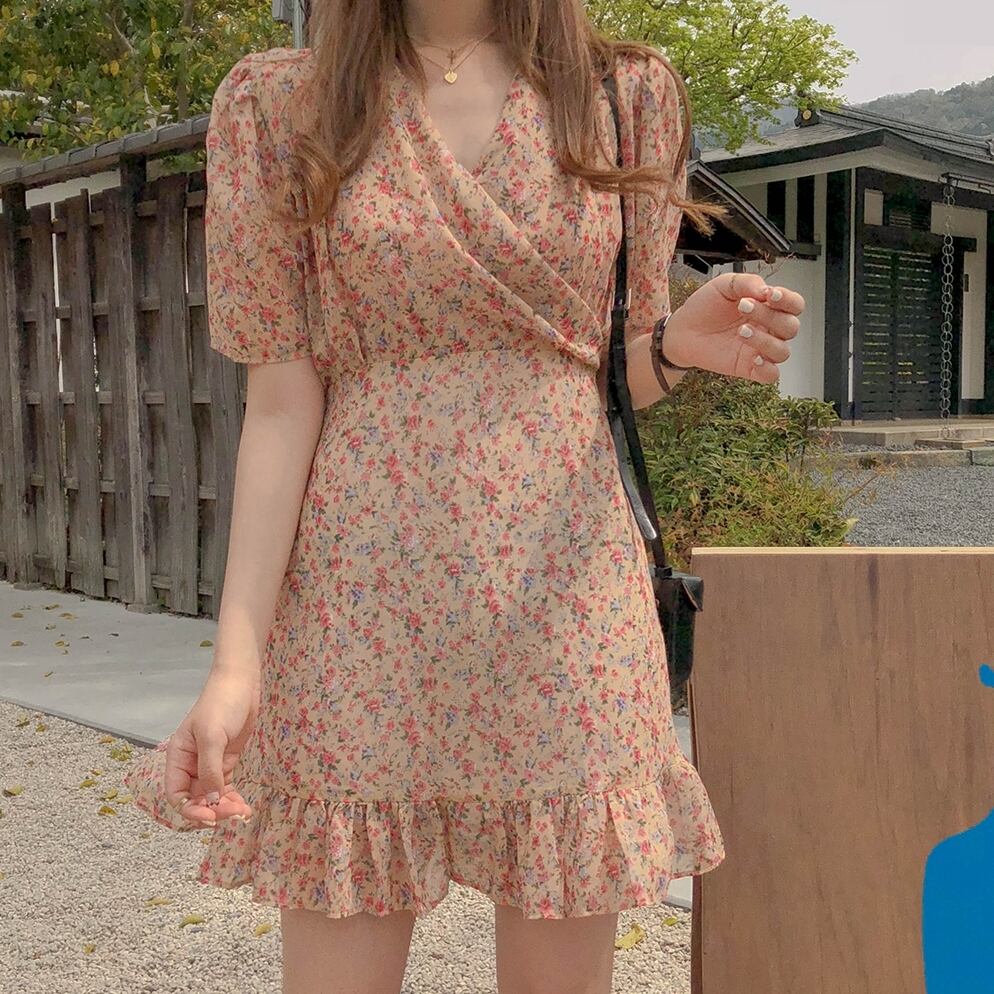 花柄 ワンピース 半袖 カシュクール Vネック ミニ ワンピ フラワー フリル シフォン ハイウエスト おしゃれ かわいい レトロ フェミニン ガーリー 妹コーデ 女子 レディース フローラル エレガント 大人 クラシカル 春 夏