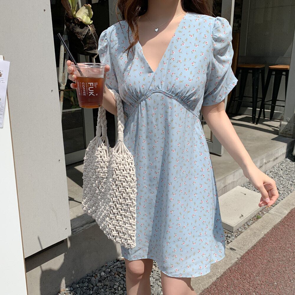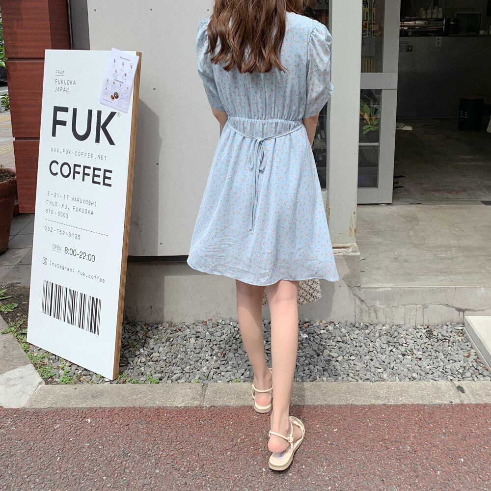 シフォン ワンピース 花柄 エンパイア Aライン 半袖 ギャザー フラワー柄 Aライン リボン Vネック 女子 レディース 大人 ガーリー フェミニン おしゃれ レトロ クラシカル シック かわいい デート おでかけ 上品 エレガント 春 夏