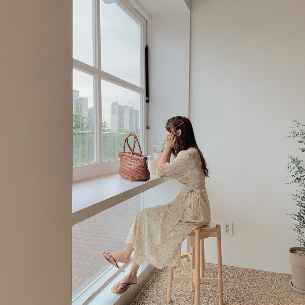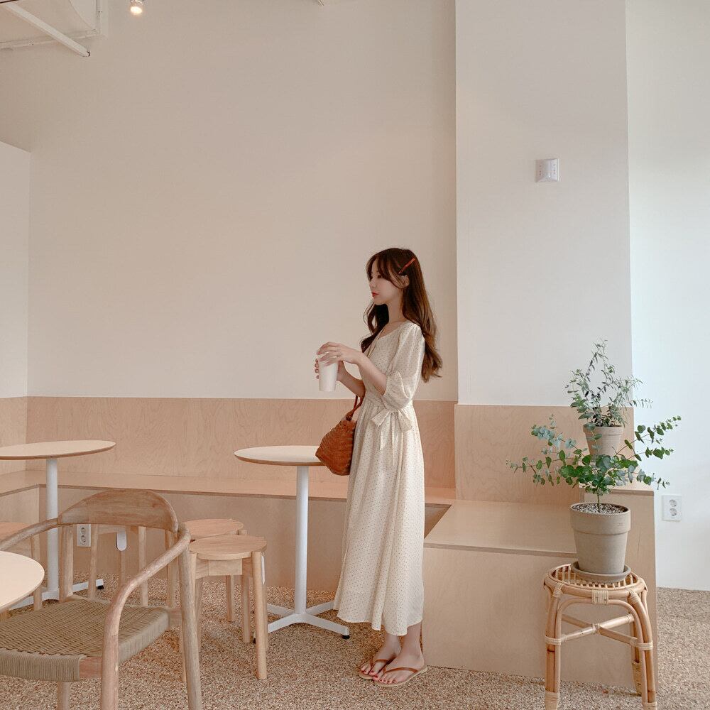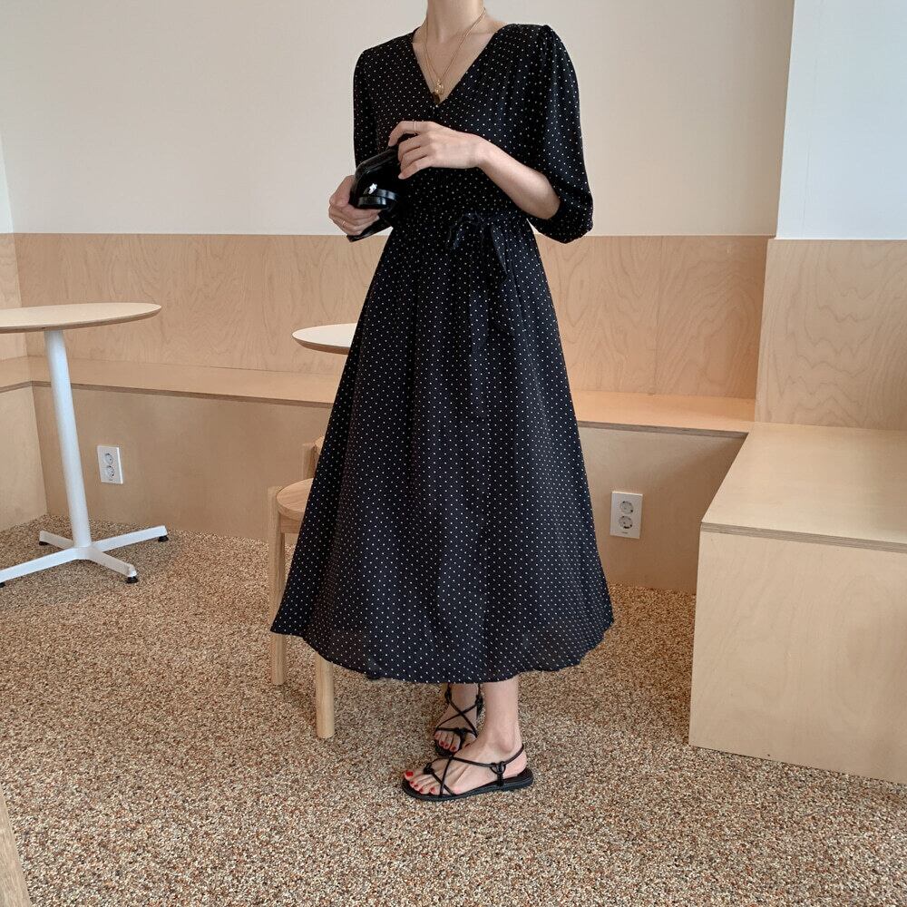 全2色 ワンピース ロング ワンピ ドット柄 水玉柄 ウエストマーク リボン Vネック 七分袖 フレア Aライン レディース 大人 女子 エレガント シック クラシカル ナチュラル フェミニン ガーリー 春 夏 秋