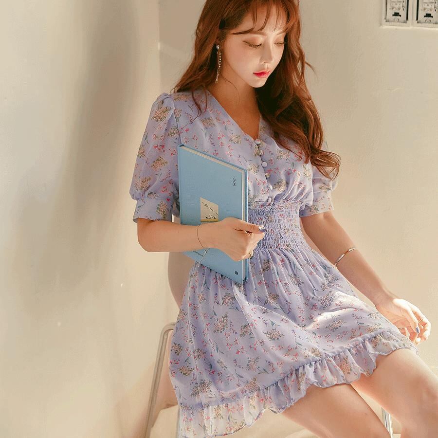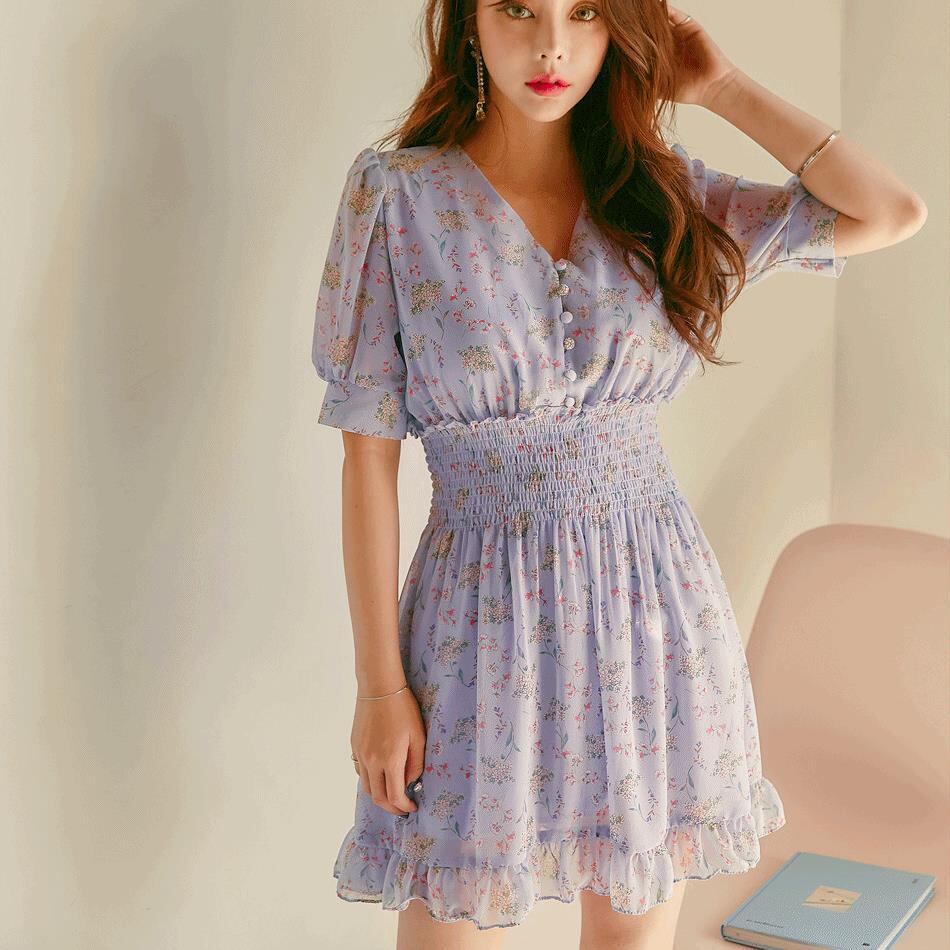 花柄 ワンピース ミニ ワンピ フリル フレア シースルー シフォン Vネック ハイウエスト ウエストゴム フラワー柄 ガーリー フェミニン おしゃれ 姫系 かわいい クラシカル シック キャバ嬢 おしゃれ 大人 レディース 春 夏