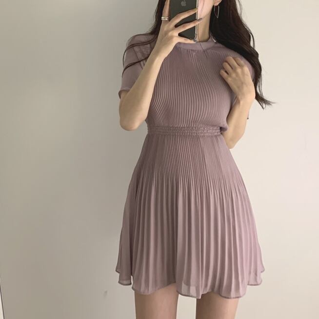 全3色 ワンピース 5分袖 プリーツ ワンピ ミニ 膝上 シンプル 無地 ラウンドネック シフォン ウエストゴム 女子 レディース 大人 フェミニン エレガント 上品 お呼ばれ フォーマル デート パーティー 春 夏