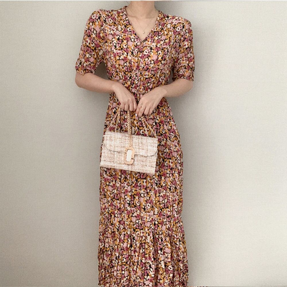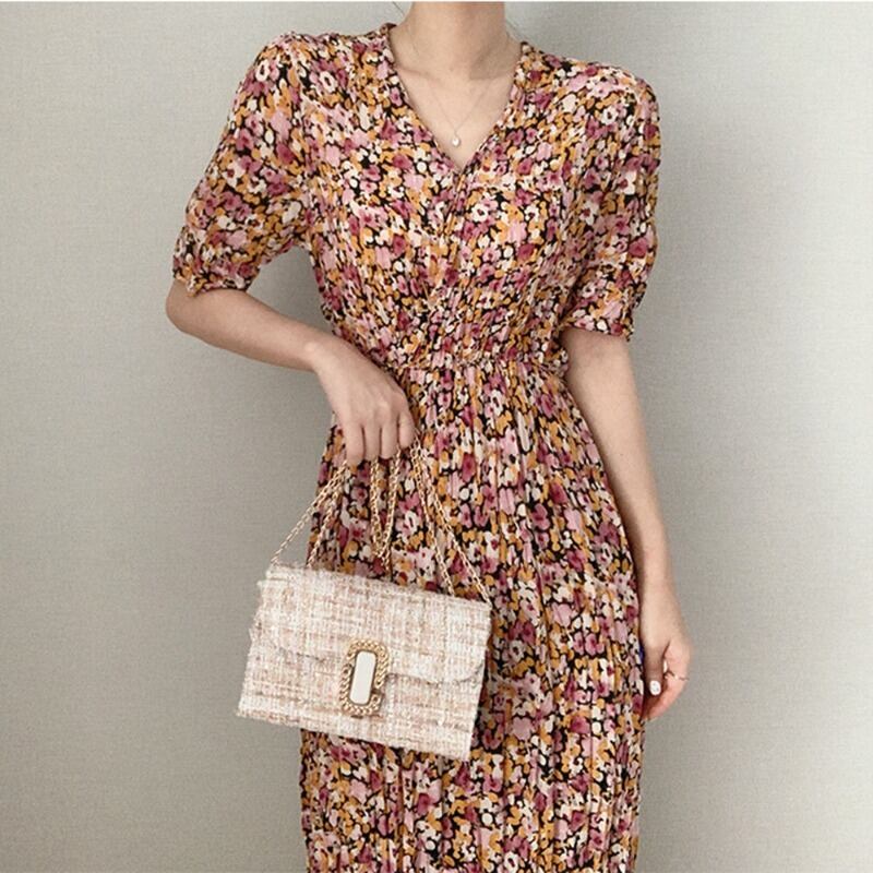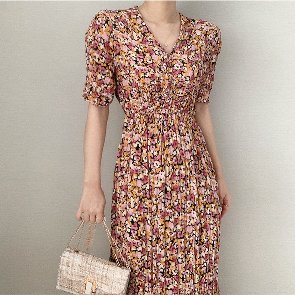 全2色 ワンピース 花柄 Vネック フラワー柄 パフスリーブ ウエストゴム ロング ワンピ レトロ 上品 エレガント かわいい アンティーク クラシカル クラシック おしゃれ デート おでかけ カフェ ランチ 飲み会 OL 春 夏