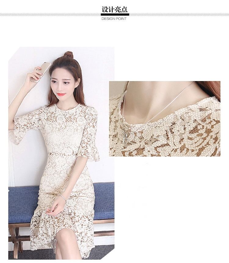 全3色 総レースワンピース 膝丈 無地 ラウンドネック 半袖 透け感 ベルスリーブ バックシャン エレガント デート イベント