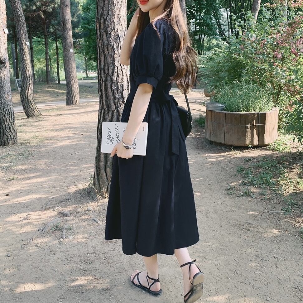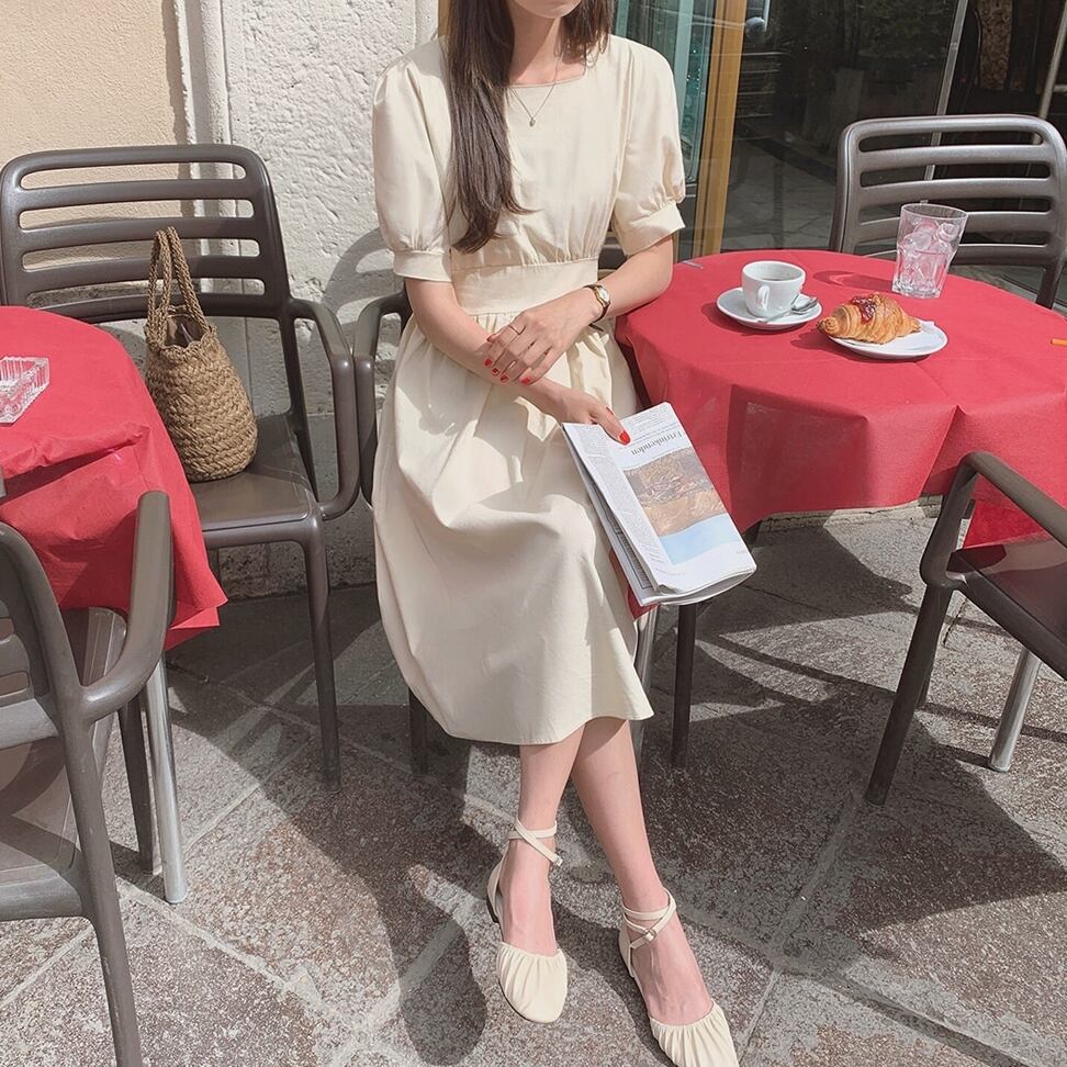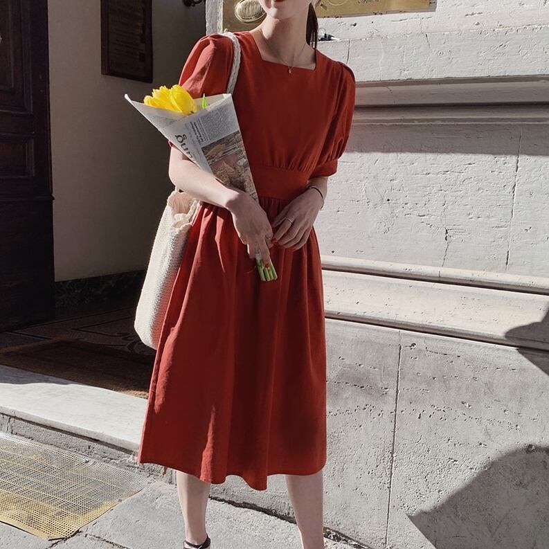 全3色 ワンピース フレア ウエストリボン バックリボン 半袖 スクエアネック 楽ちん Aライン ハイウエスト レトロ コットン リネン デイリー 夏秋 デート 清楚 エレガント 可愛い レディース アパレル