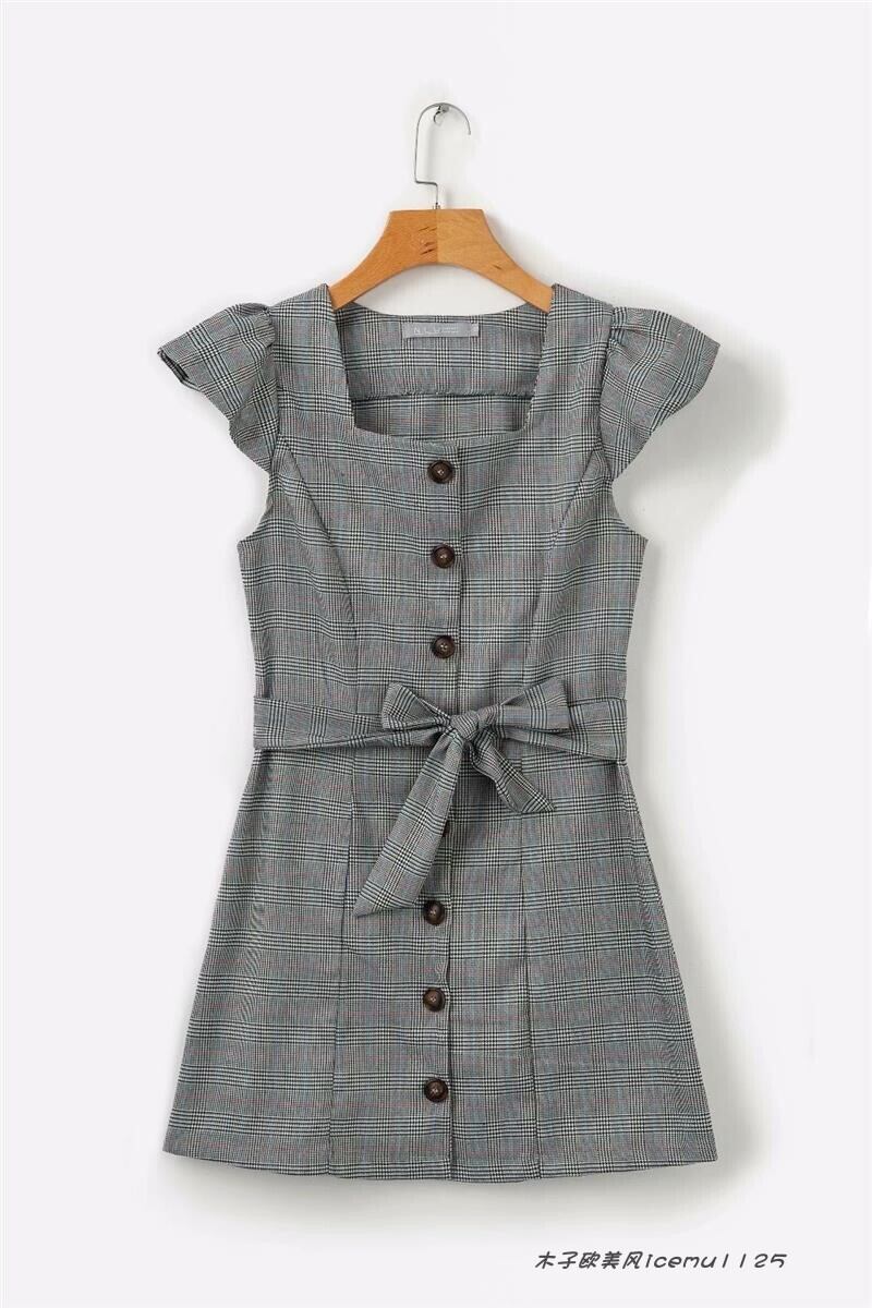 グレンチェックワンピース ミニ丈 ハイウエストフリル ウエスト リボン 前ボタン スクエアネック Vライン 袖フリル モード かわいい おしゃれ