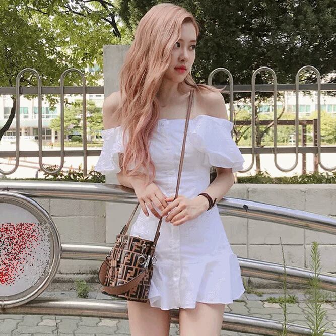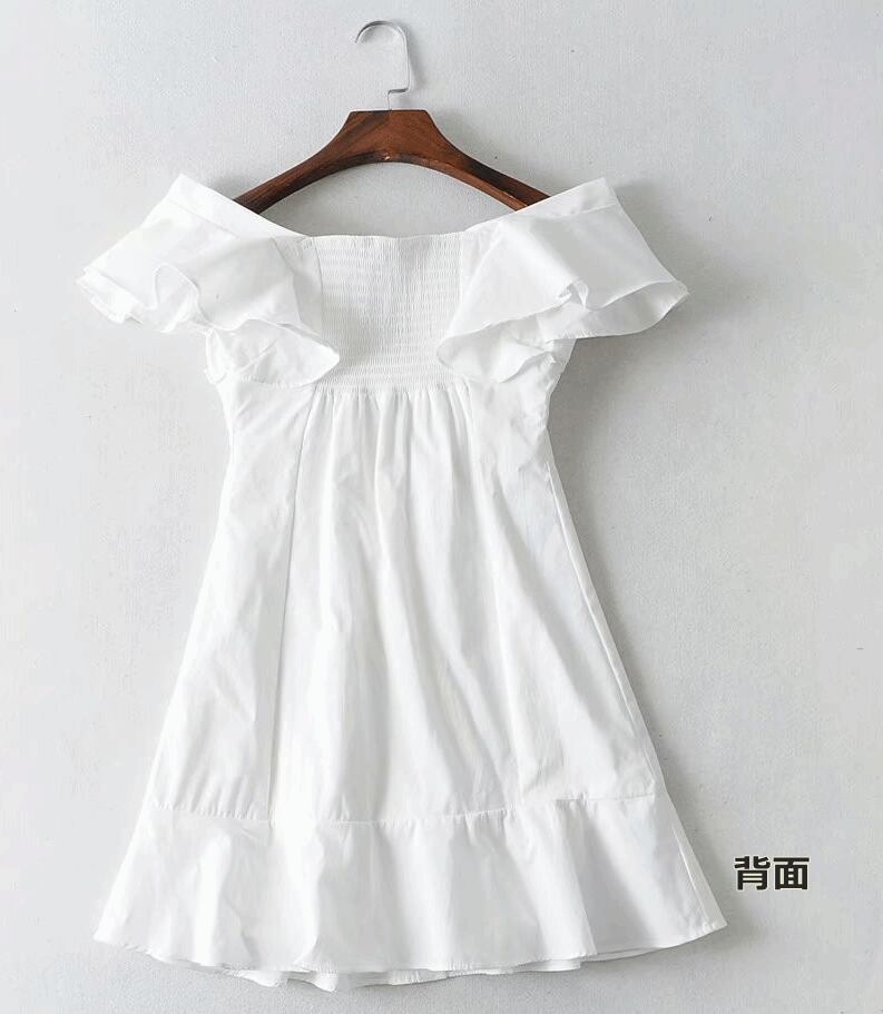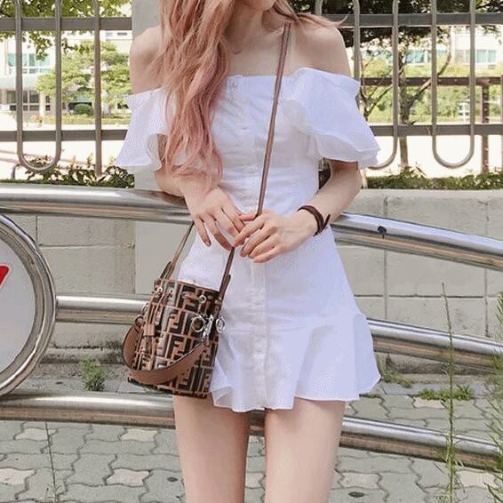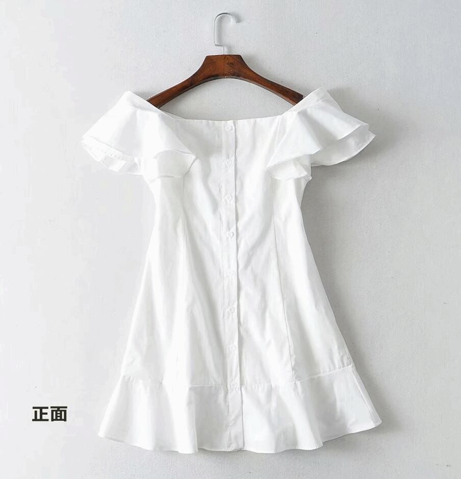 オフショルワンピース フレア 袖フリル 前ボタン シンプル 清楚 肌見せ レトロ 袖コンシャス 夏 ビーチ リゾート かわいい