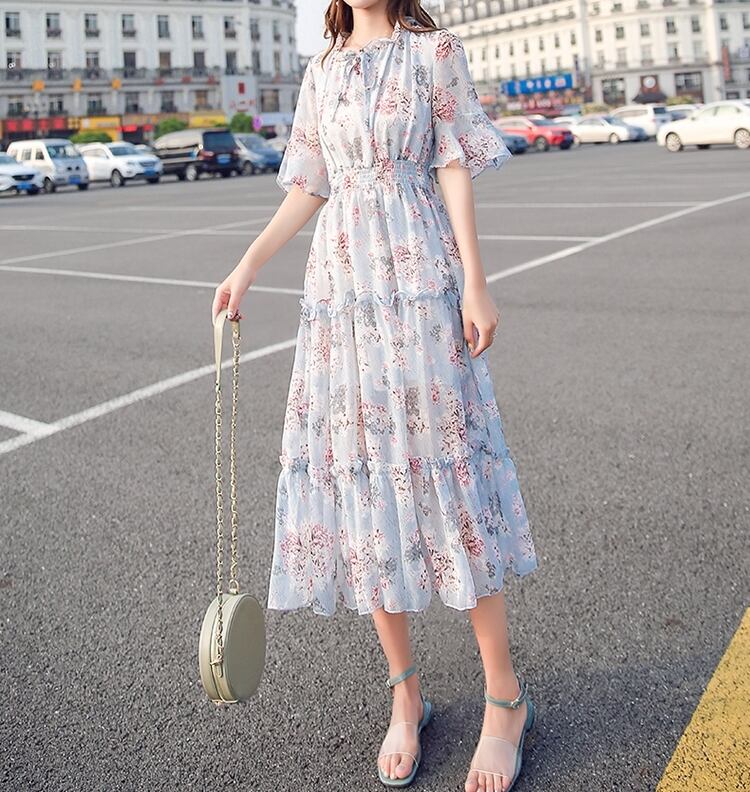 全2色 ワンピース ティアード フリル ミモレ丈 フレア 5分丈 リゾート 花柄 可愛い シフォン
