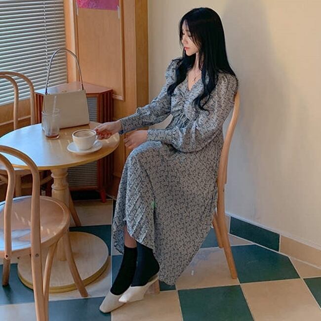 全2色 小花柄 ワンピース プリーツ ミモレ丈 フレア Vネック 長袖 パフスリーブ フロントコンシャス 無地 大人可愛い カジュアル きれいめ リゾート デート 春 夏