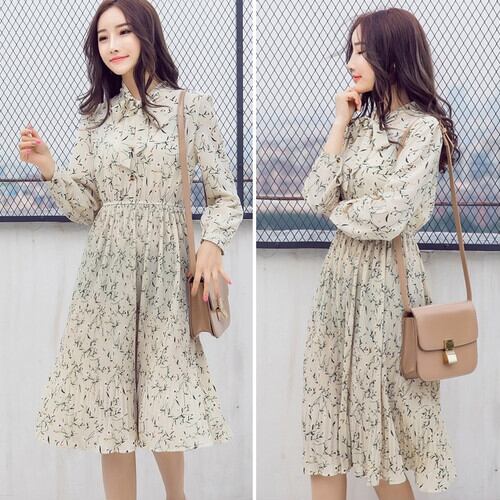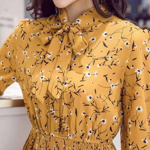 全3色 シャツワンピース シフォン リボン 花柄 長袖 ミモレ丈 ロング プリーツスカート フロントボタン ギャザー 襟有り 大人可愛い お出かけ 春秋