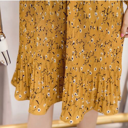 襟もとのリボンと裾のフリルが大人可愛い花柄ワンピースです。