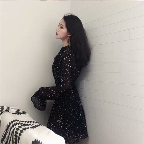 全2色 ショート丈 星柄 Vネック シフォン ワンピース ドレス 大人 可愛い カジュアル キレイめ エレガント 上品 お出かけ お買い物 デート 女子会 春 夏 通学 学生 通勤 韓国ファッション