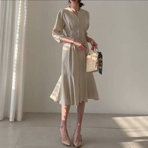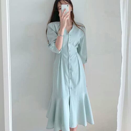 全2色 Vネック シャツ ロング丈 ワンピース フィッシュテール 大人 可愛い カジュアル キレイめ 上品 お出かけ お買い物 デート 女子会 春 夏 通学 学生 通勤 韓国ファッション