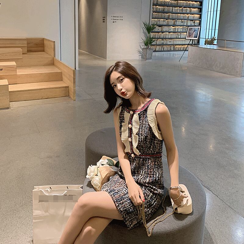ワンピース ノースリーブ ショート丈 フロントボタン フリル ラウンドネック スリム ツイード きれいめ カジュアル 大人 女子会 デート 春 冬 秋