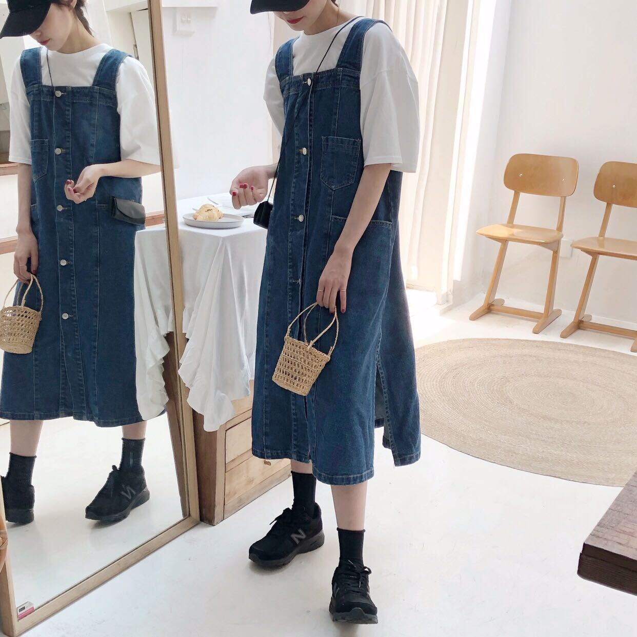 ワンピース サロペットスカート ロング丈 ゆったり ビッグシルエット サイドスリット フロントボタン オーバーサイズ デニムワンピース ジーンズ カジュアル デイリー 韓国ファッション デート 夏 春