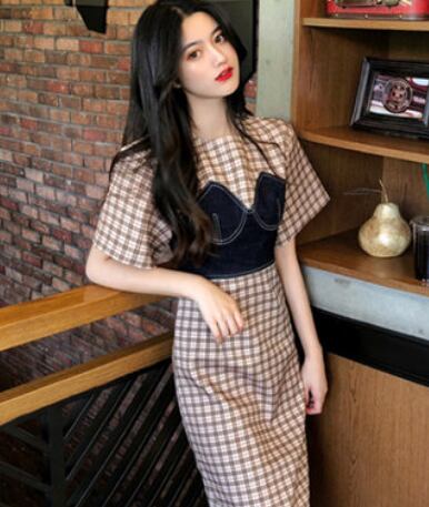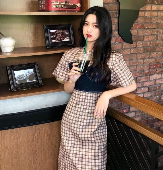 フェイクツーピース ワンピース チェック柄 ミモレ丈 デニムビスチェ 5分袖 ラウンドネック スリム ガーリー 大人可愛い 上品 トレンド デート 韓国ファッション カジュアル おしゃれ 春 夏
