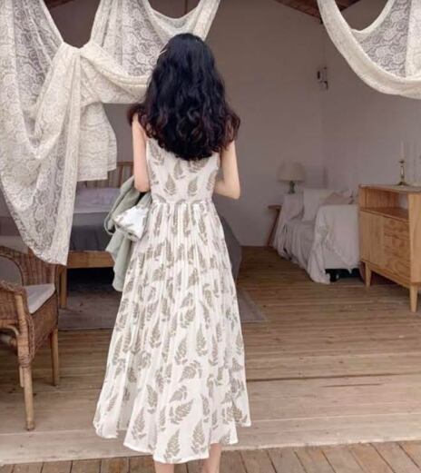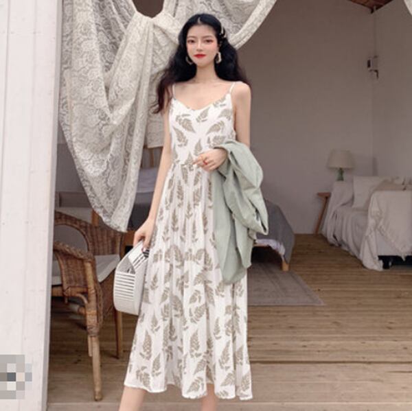 ワンピース ロング丈 ゆったりめ プリーツ フレア キャミワンピース リーフ柄 花柄 大人可愛い 上品 カジュアル きれいめ 女子会 リゾート デート 春 夏