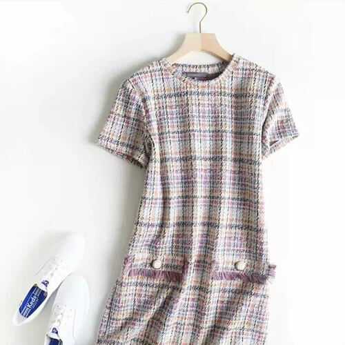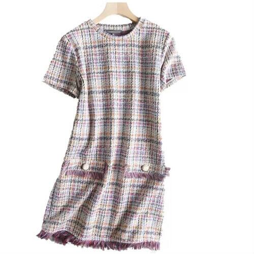 半袖 ラウンドネック チェック柄 明るめ ワンピース フリンジ 大人 可愛い エレガント 上品 キレイめ カジュアル お出かけ お買い物 デート 女子会 春 夏 通学 学生 通勤 韓国ファッション