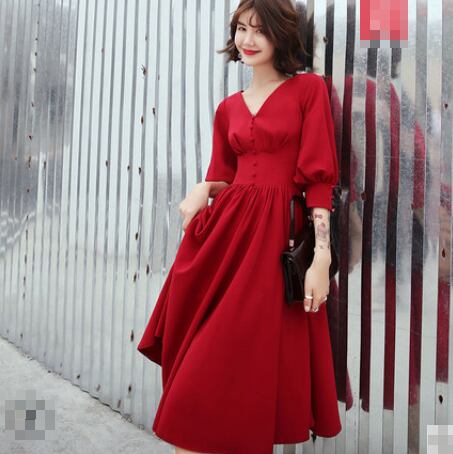全3色 ワンピース ドレス 7分袖 ハイウエスト フレア スリム フロントボタン Vネック パフスリーブ ミディ丈 大人 カジュアル きれいめ 無地 お呼ばれ ディナー 春 夏 大きいサイズ