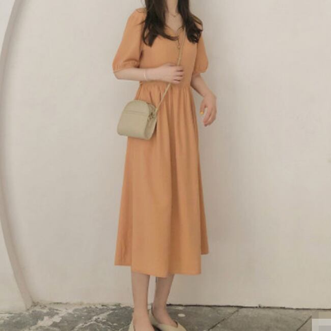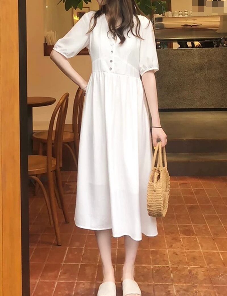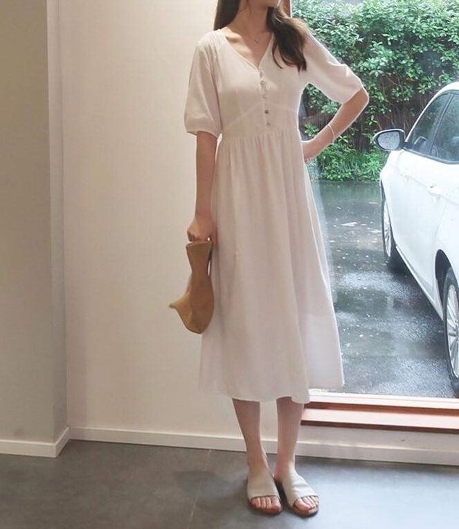 全2色 ワンピース ミモレ丈 フレア ボタン Vネック 5分袖 無地 大人可愛い カジュアル きれいめ シンプル リゾート 春 夏
