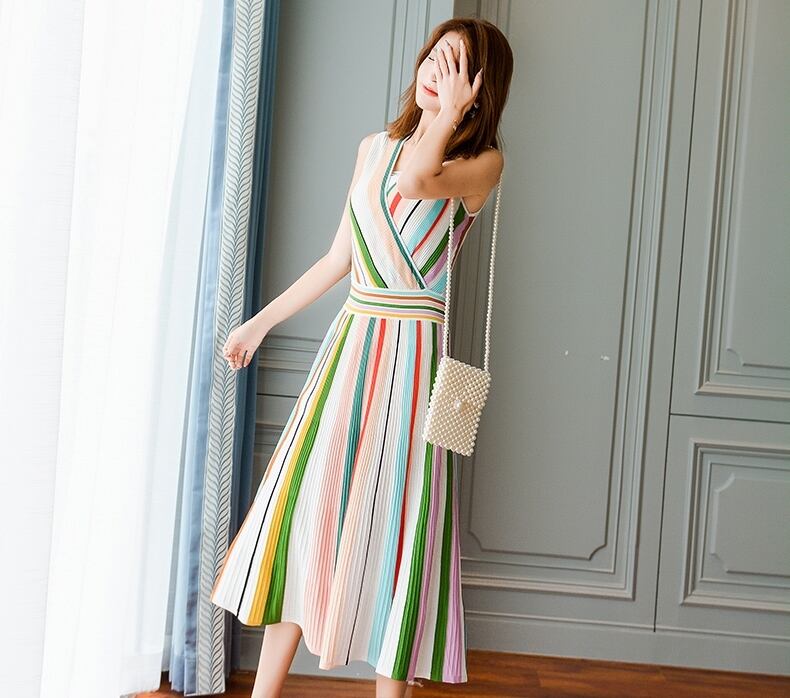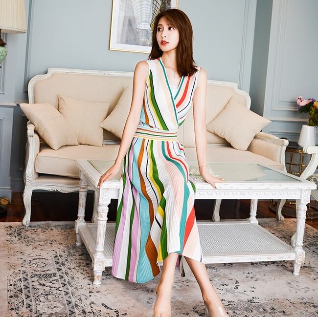 カシュクールワンピ ワンピース ストライプ Vネック ノースリーブ フレア ロング丈 上品 大人可愛い プリーツ カラフル レインボー カジュアル きれいめ デート 女子会 夏