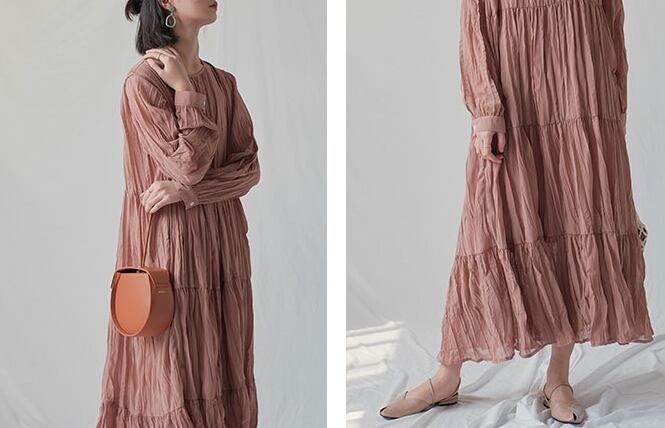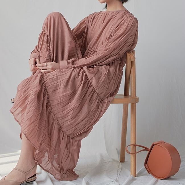 全2色 ワンピース ロング丈 ティアード 長袖 ラウンドネック シフォン プリーツ シンプル レトロ カジュアル デイリー ナチュラル 森ガール 大人 ゆったり ビッグシルエット リラクシー 春 夏