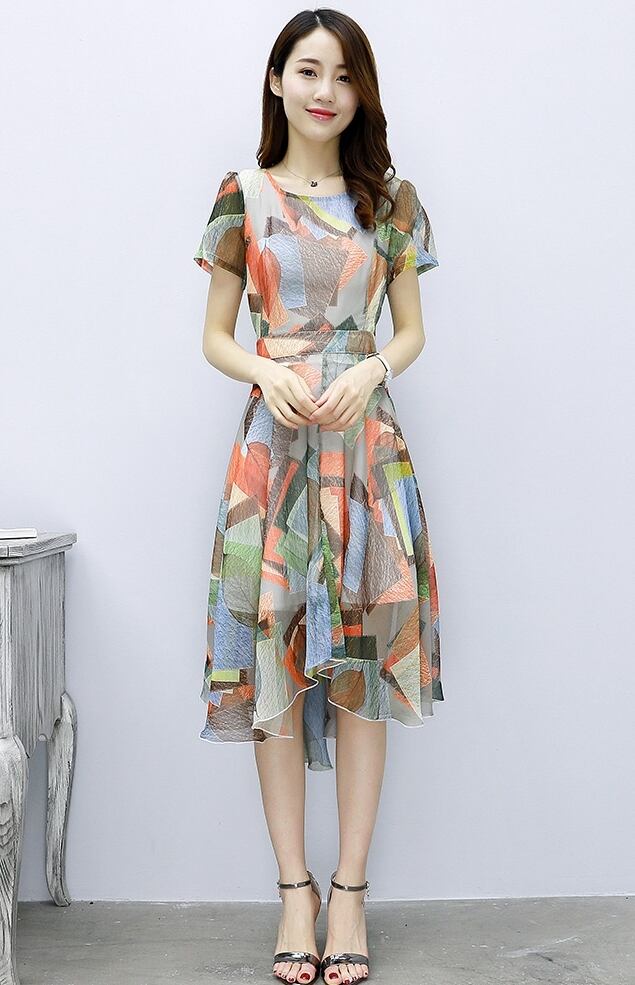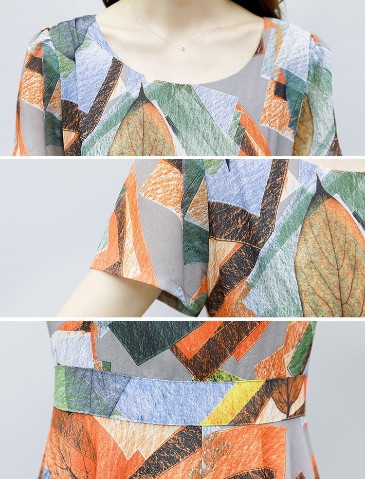 全2色 ワンピース ラウンドネック リーフ柄 半袖 ハイウエスト 可愛い フレア シフォン シースルー アシンメトリー ミディ丈 リゾート Aライン カジュアル きれいめ 夏 春