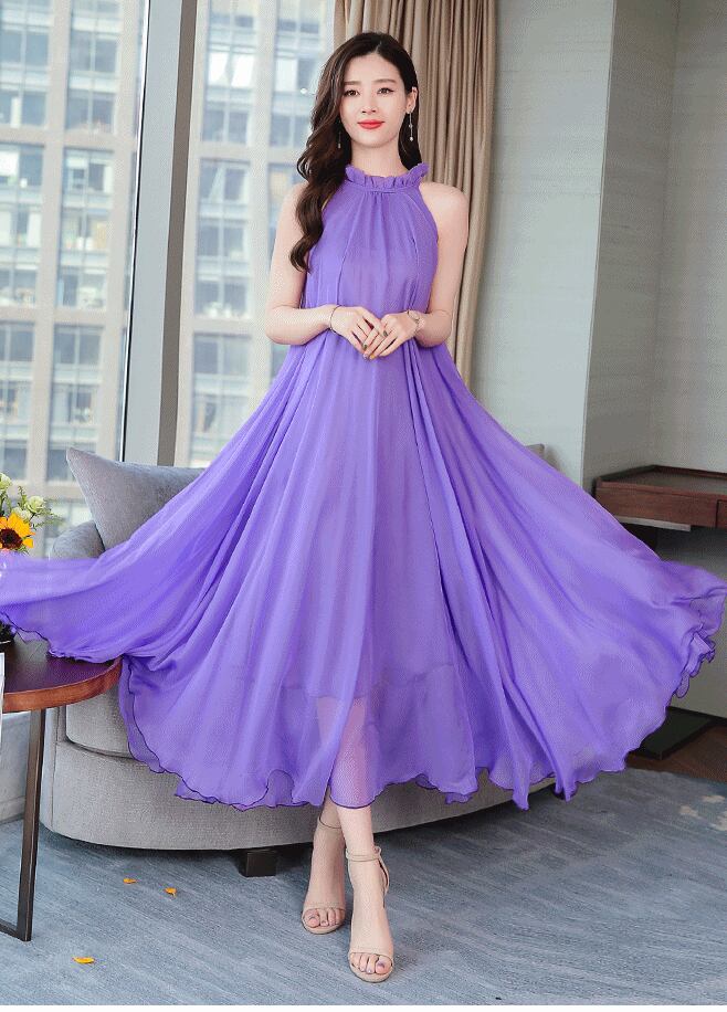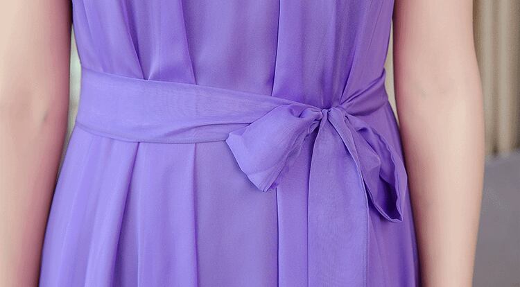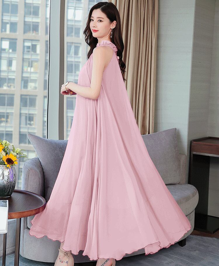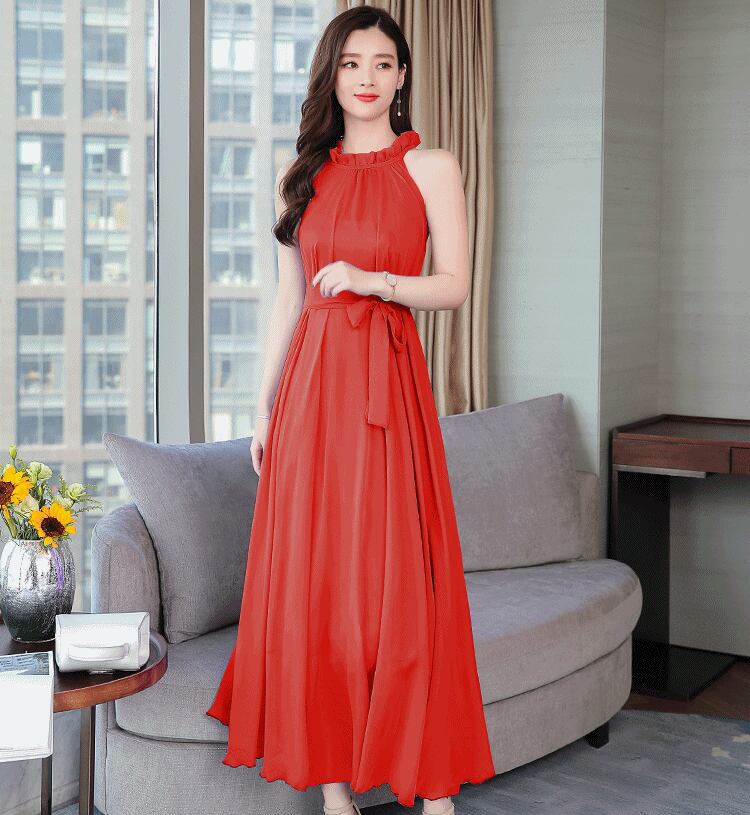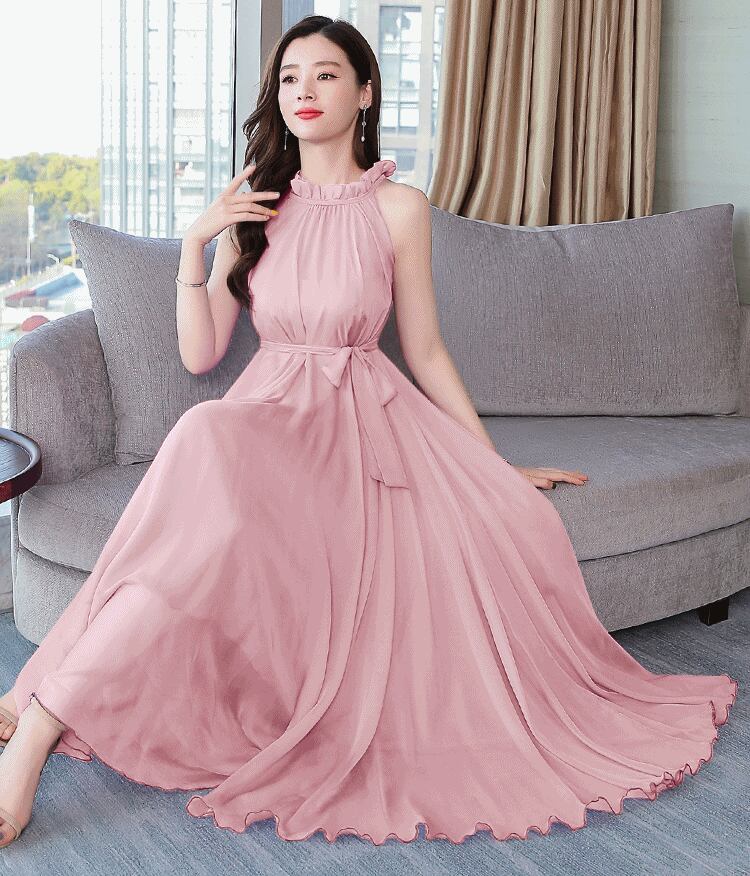 全5色 ワンピース ドレス クルーネック ウエストリボン ハイウエスト フレア Aライン ネックフリル ノースリーブ ロング丈 シフォン きれいめ エレガント 上品 お呼ばれ パーティー ナイト オケージョン 春 夏
