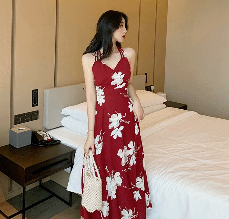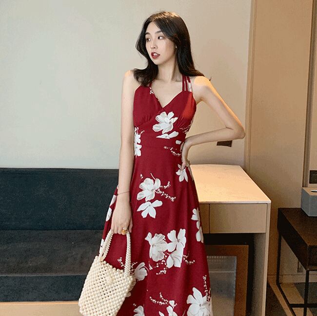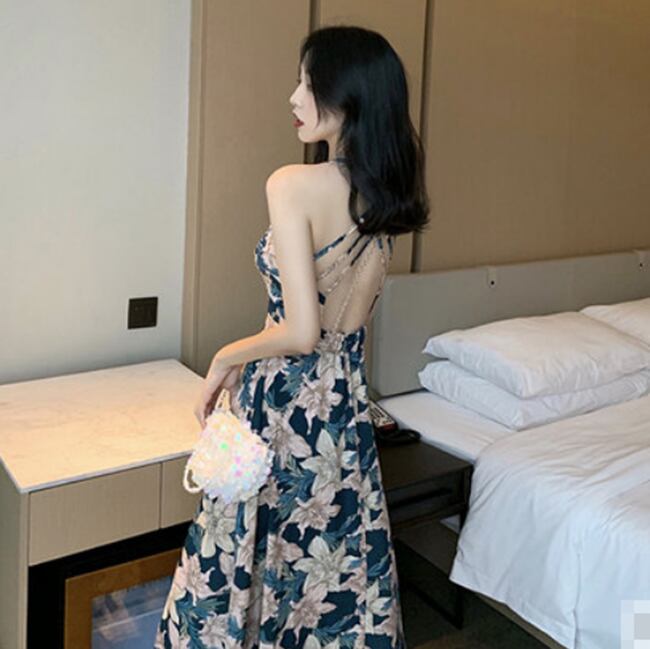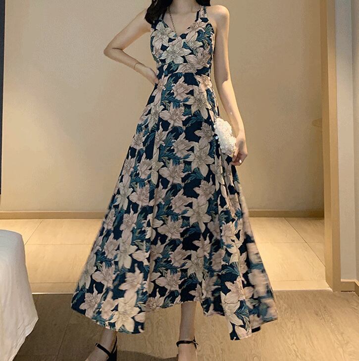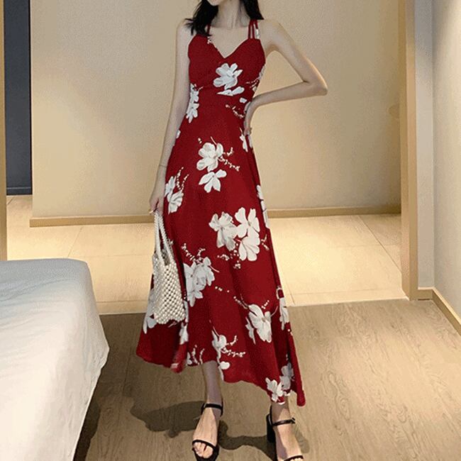 全3色 花柄 ワンピース バックコンシャス バックシャン Vネック キャミソールワンピ フレア ロング丈 ハイウエスト Vネック カジュアル 大人可愛い きれいめ リゾート 夏