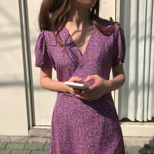 Vネックの花柄レトロワンピース♪