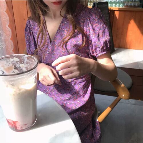 花柄 Vネック リボン ワンピース 半袖 ロング丈 大人 カジュアル キレイめ 可愛い リゾート お出かけ お買い物 デート 女子会 通学 学生 通勤 韓国ファッション
