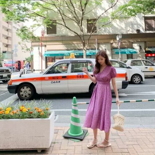 花柄 Vネック ウエストスリム ワンピース Aライン ロング丈 大人 カジュアル キレイめ 可愛い お出かけ お買い物 デート 女子会 通学 学生 通勤 韓国ファッション