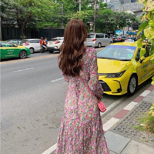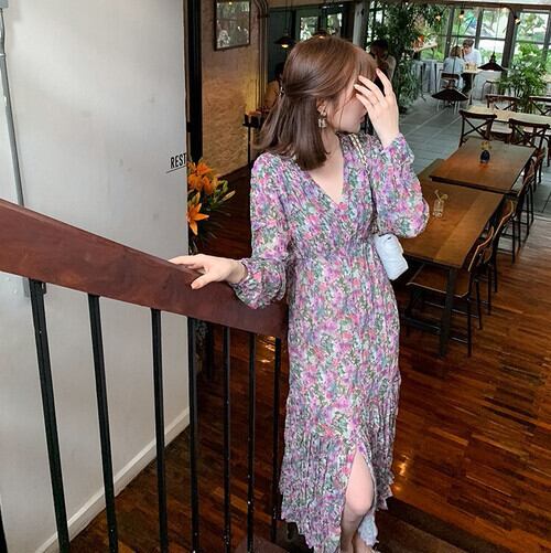 全2色 ロングワンピース 小花柄 Vネック 長袖 フレアスカート フリル ギャザー スリット レトロ ゆったり きれいめ カジュアル セクシー フェミニン お出かけ パープル ブルー