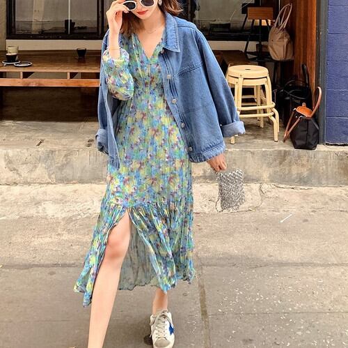 レトロな花柄がフェミニンな印象のロングワンピース。