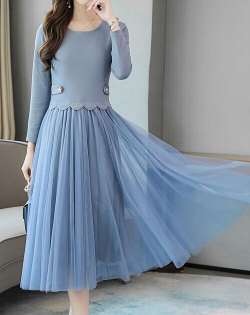 ウエストの切替がアクセントになったミディ丈ワンピース。